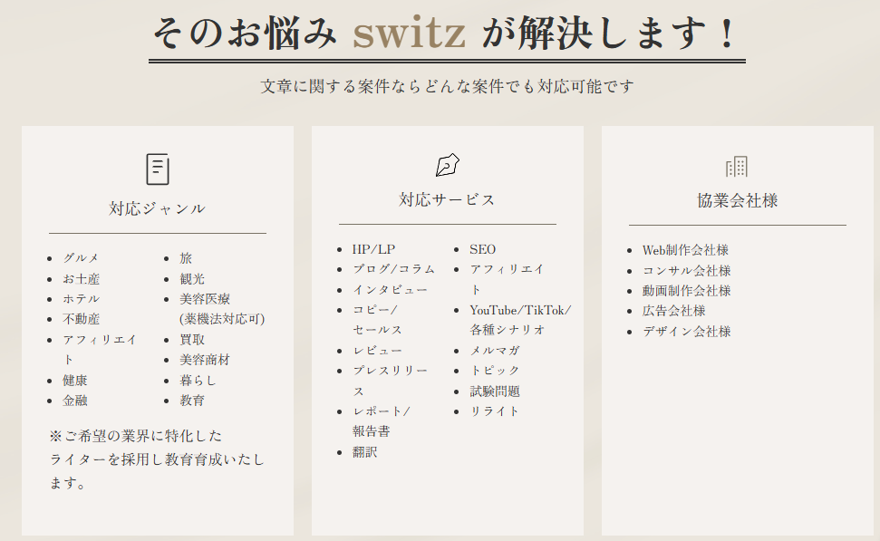 【ビジネス内容】ライター会社をしております株式会社switz(スイス)の中川と申します。