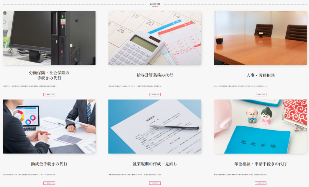 (・社会保険労働保険の手続き・給与計算の代行・労務コンサルティング・就業規則など各種来て作成見直し・年金相談および手続き・企業型確定拠出年金の導入支援など)